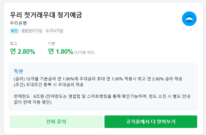 우리은행 **‘우리 첫거래우대 정기예금’**은 기존 거래가 없는 신규 고객일수록 혜택이 큰 상품입니다.